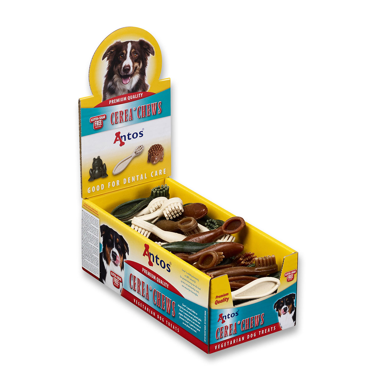 Antos Cerea Toothbrush dog chews are 100% natural dog snacks made from compounded vegetable fibers with natural. Colouring and minimal fat content. The toothbrushes are completely edible and have a unique texture that helps to remove plaque and tartar from your pets’ teeth as they chew. They are Wheat and Gluten free.